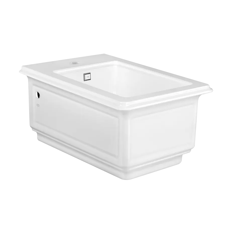 Подвесное биде в керамике с переливом и центральным отверстием под смеситель. Пробки для боковых отверстий в отделке 031