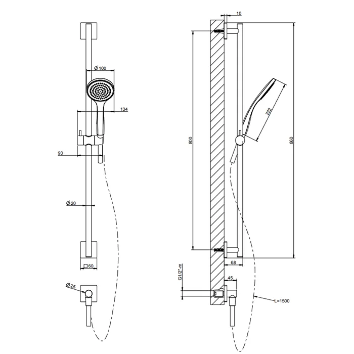 Штанга в комплекте с душевой лейкой, шланг 1,50 м и вывод воды