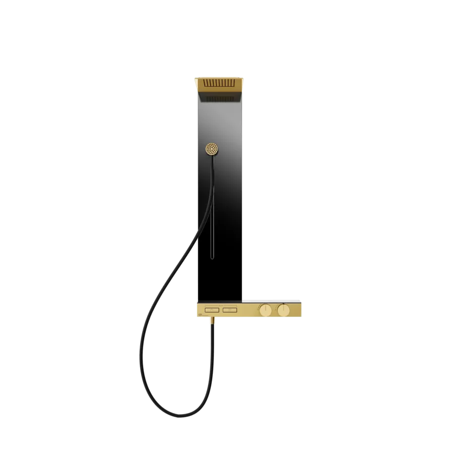 Настенный термостатический смеситель, до 2 функций одновременно с кнопками вкл/выкл. В комплекте с душевой головкой и магнитнымручным душем на штанге.
