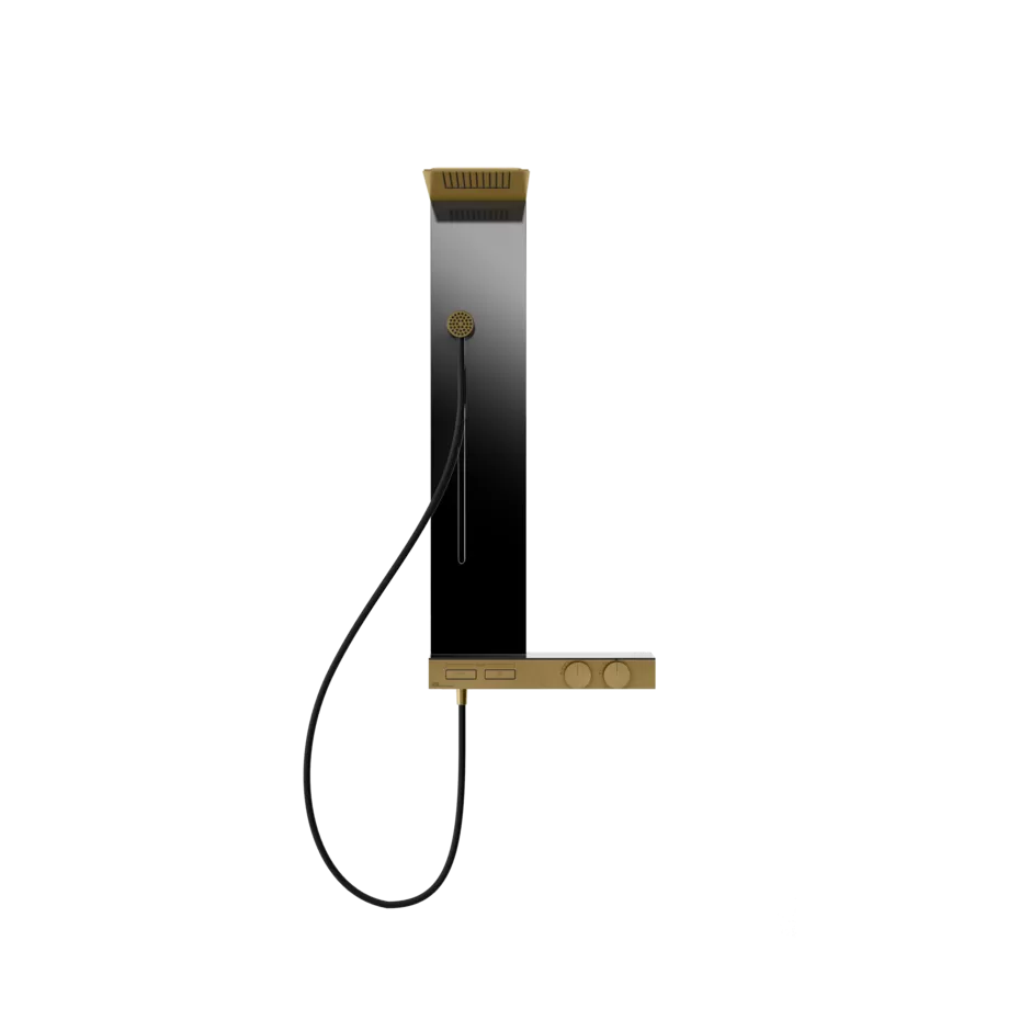 Настенный термостатический смеситель, до 2 функций одновременно с кнопками вкл/выкл. В комплекте с душевой головкой и магнитнымручным душем на штанге.