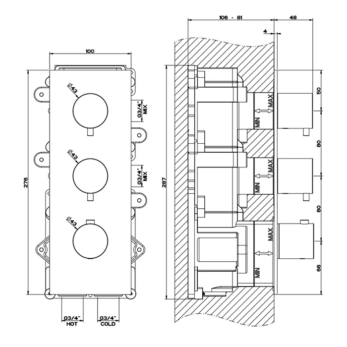 Смеситель для ванны/душа термостатический скрытого монтажа внешняя часть 2 потока GESSI316 299 Black XL GESSI