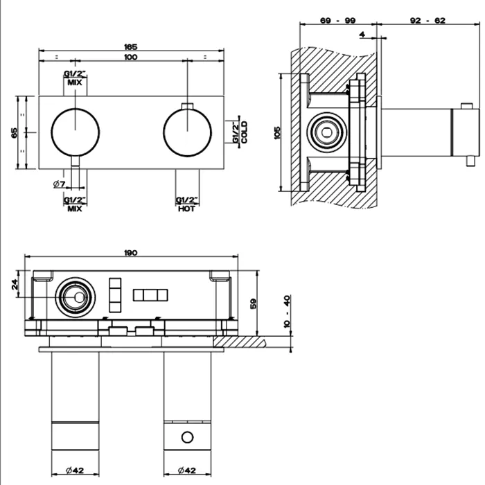 Смеситель для ванны/душа термостатический скрытого монтажа внешняя часть 2 потока GESSI316 707 Black Metal Brushed PVD GESSI