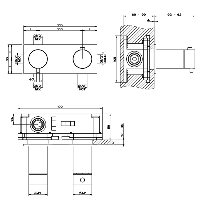 Смеситель для ванны/душа термостатический скрытого монтажа внешняя часть 3 потока GESSI316 707 Black Metal Brushed PVD GESSI