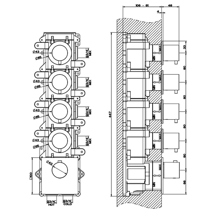 Смеситель для ванны/душа термостатический скрытого монтажа внешняя часть 4 потока GESSI316 707 Black Metal Brushed PVD GESSI