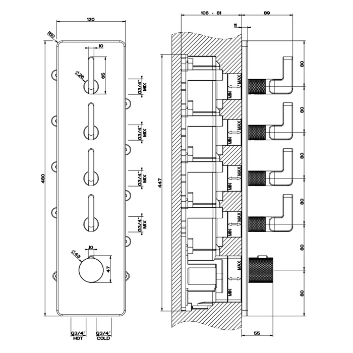Смеситель для ванны/душа термостатический скрытого монтажа внешняя часть 4 потока INCISO 299 Black XL GESSI