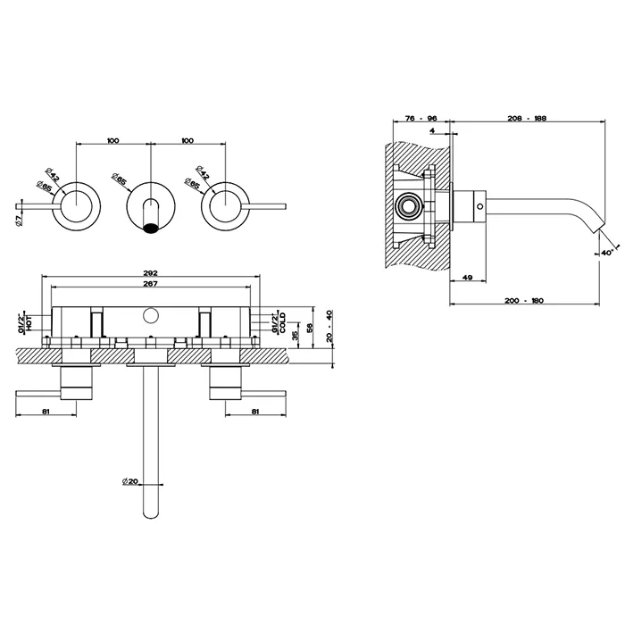 Смеситель для раковины настенный скрытого монтажа на 3 отверстия с длинным изливом FLESSA 707 Black Metal Brushed PVD GESSI