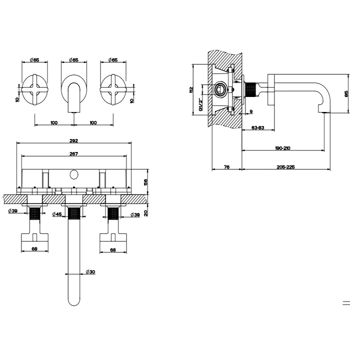 Смеситель для раковины настенный скрытого монтажа на 3 отверстия с средним изливом INCISO + 246 Gold PVD GESSI