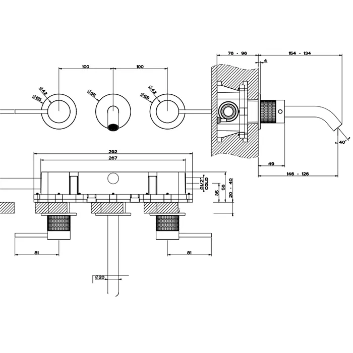 Смеситель для раковины настенный скрытого монтажа на 3 отверстия с средним изливом MECCANICA 707 Black Metal Brushed PVD GESSI