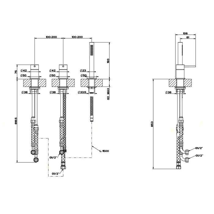 Смеситель на борт ванны 3 отверстия наполнение через слив-перелив с душевым набором GESSI316 239 Steel Brushed GESSI