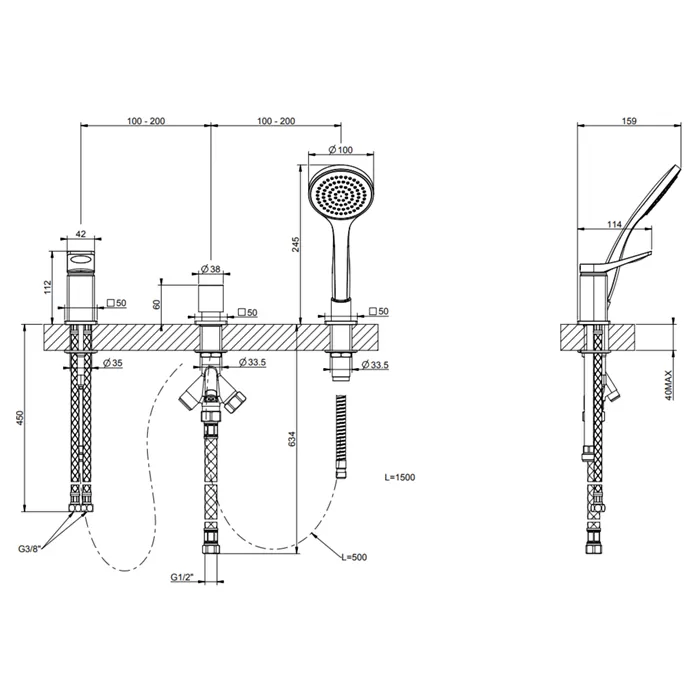 Смеситель на борт ванны 3 отверстия наполнение через слив-перелив с душевым набором RILIEVO 031 Chrome GESSI
