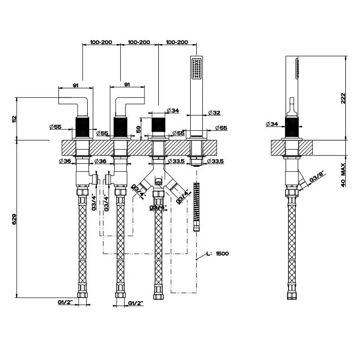 Смеситель на борт ванны 4 отверстия наполнение через слив-перелив с душевым набором INCISO 031 Chrome GESSI