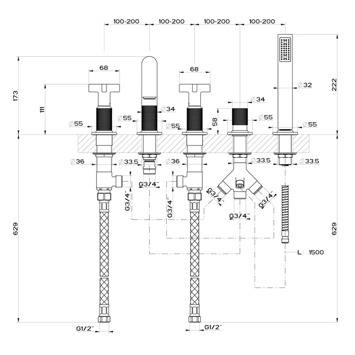 Смеситель на борт ванны 5 отверстий с изливом и душевым набором INCISO+ 299 Black XL GESSI