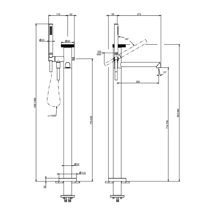 Смеситель для ванны напольный с душевым набором без скрытой части ANELLO 149 Finox Brushed Nickel GESSI
